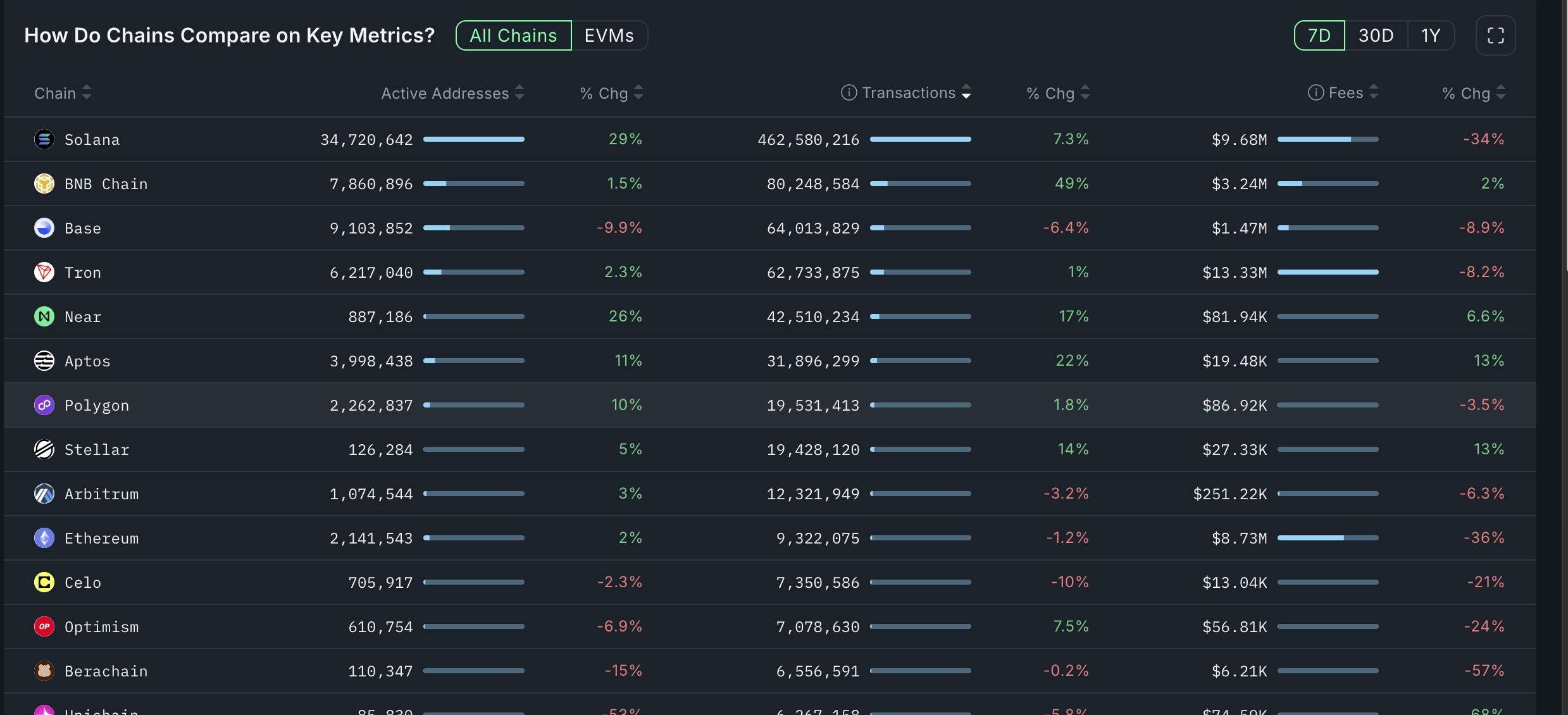 Solana’s transactions and active addresses have continued rising. Its transactions have increased by 7.3% in the last seven days to 462.5 million, a figure higher than the biggest chains, combined. For example, BNB Chain had 80 million transactions, while Base, Tron, and Near Protocol had $64 million, 62 million, and 42 million, respectively.