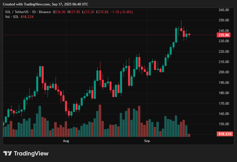 - After falling from recent highs above $250, SOL is currently trading around $234.