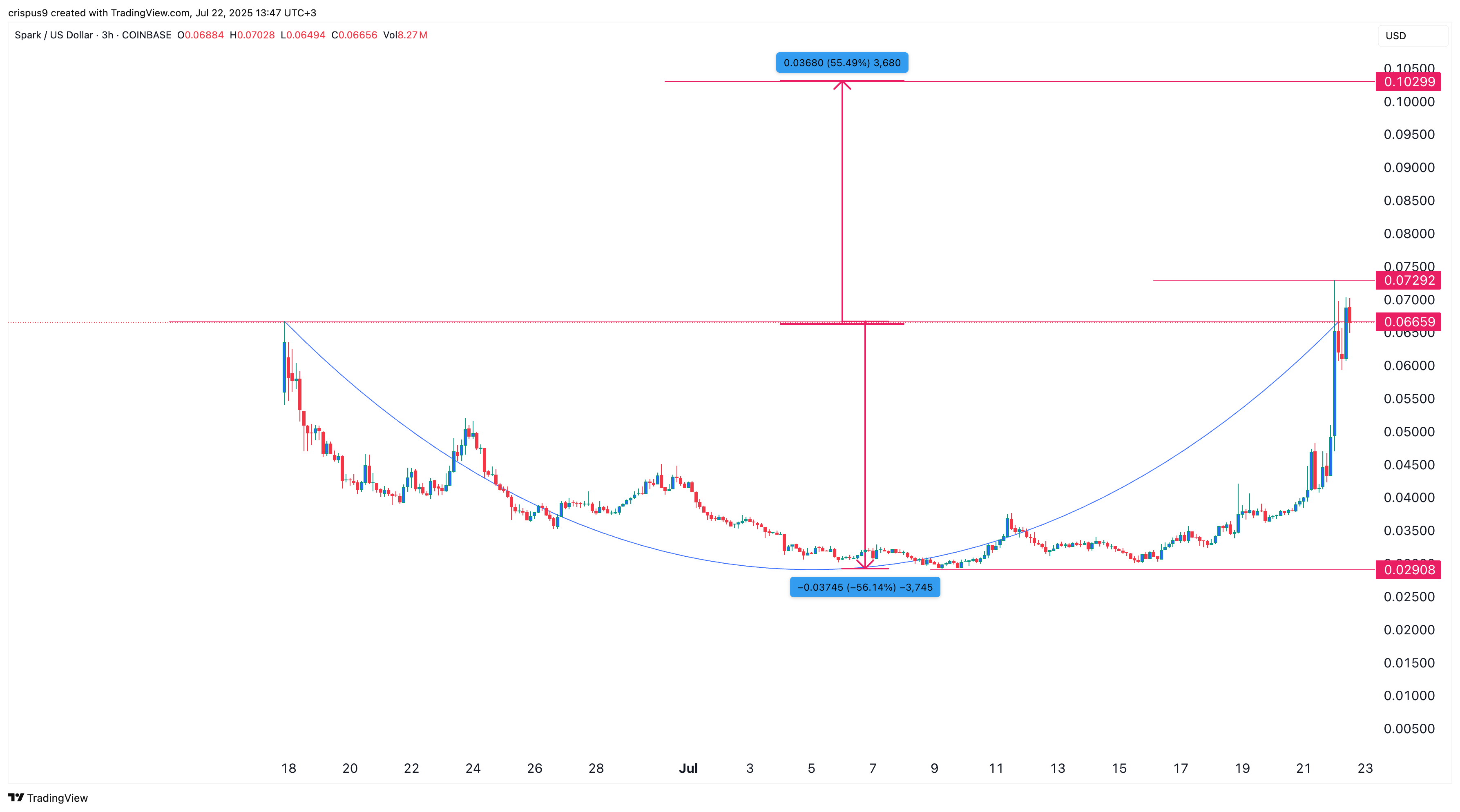 The three-hour chart shows that the Spark token price has staged a strong recovery after bottoming at $0.029 on July 9. It has slowly formed a cup-and-handle pattern, a popular bullish continuation sign in technical analysis.