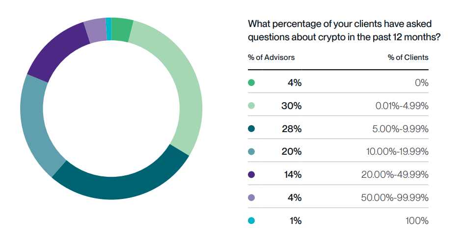 Although there are still some barriers, interest remains strong. Ninety-six percent of advisors received questions about crypto from clients in 2024, and 99% of advisors with existing crypto allocations plan to maintain or increase their exposure in 2025.
