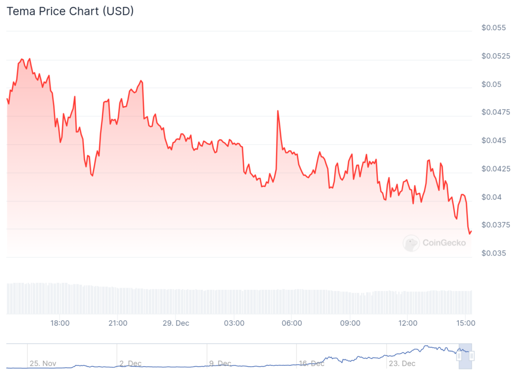 Tema (TEMA), at last check Sunday, was down about 24% and trading at $0.04046. It currently has a market cap of $40.5 million, a circulating supply of more than 999.9 million and a 24-hour trading volume of around $7.87 million.