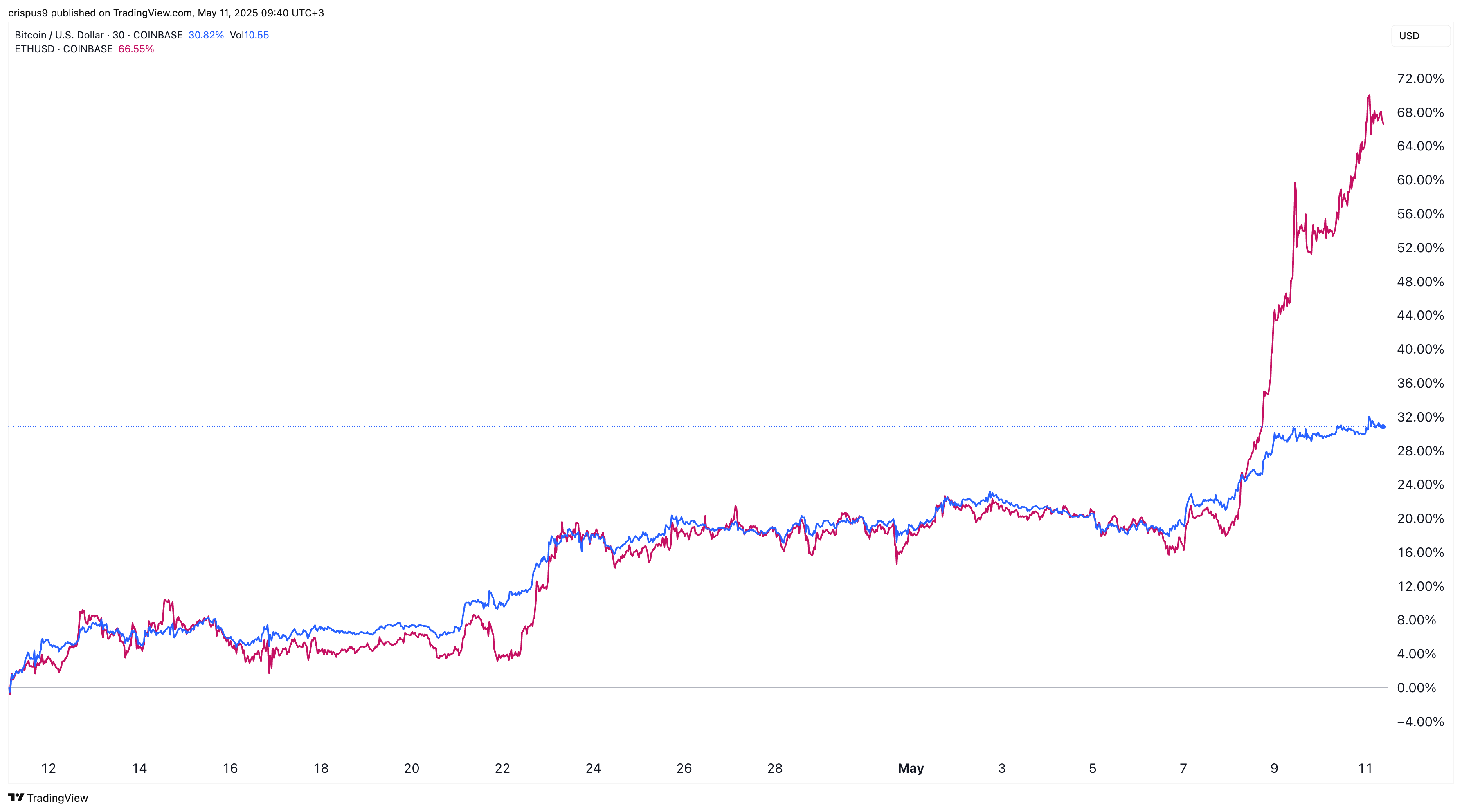 Bitcoin (BTC) cruised above $104,000 and is near the all-time high. Similarly, Ethereum (ETH) ended its consolidation and short-squeezed from $1,800 to $2,500. Other altcoins also soared, bringing the total market cap of all coins to over $3.2 trillion.