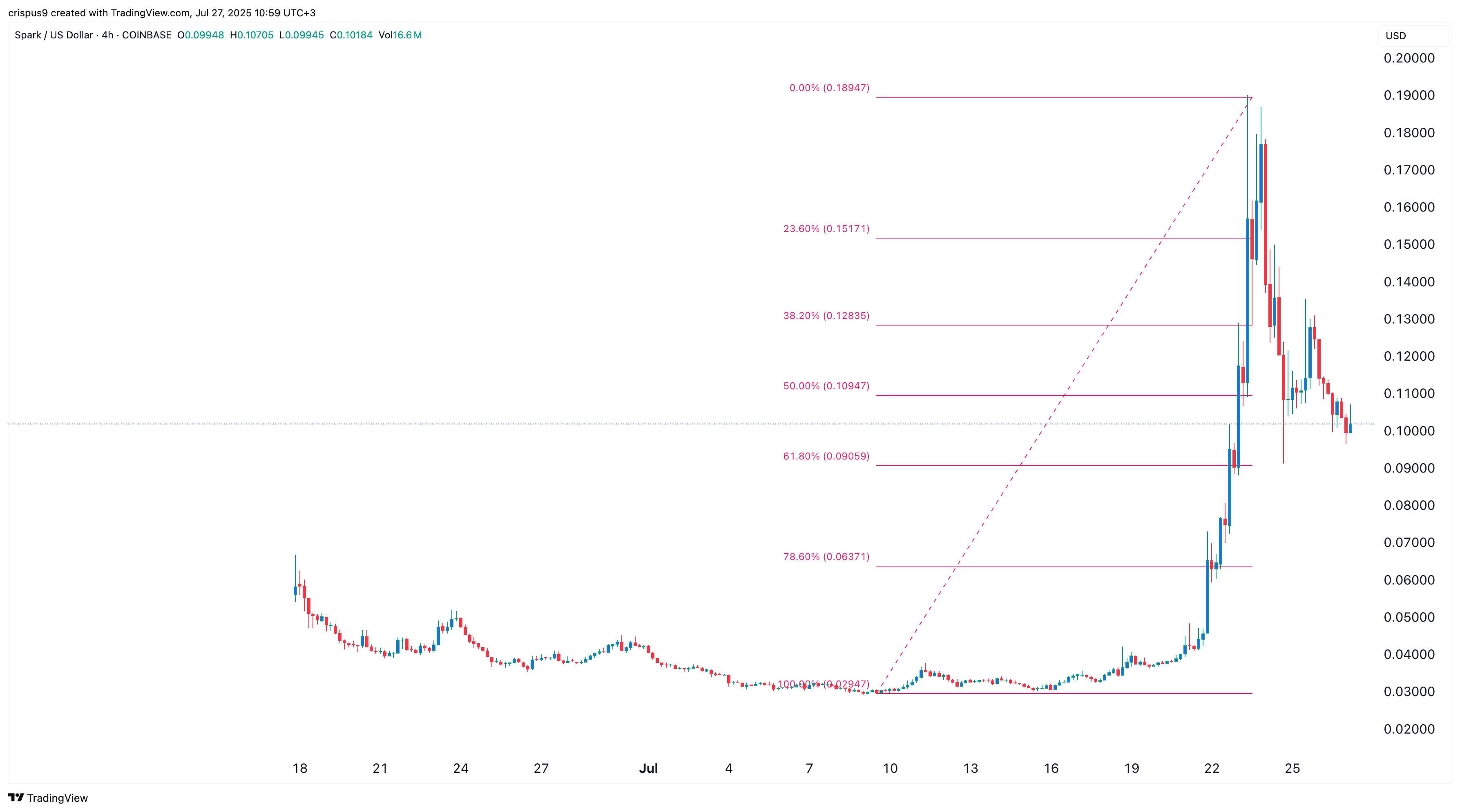Spark price has been highly volatile in the past few days. It surged by 552% from its lowest point on July 9 to its highest level last week. It has now erased some of those gains and fell by over 45% to $0.101.