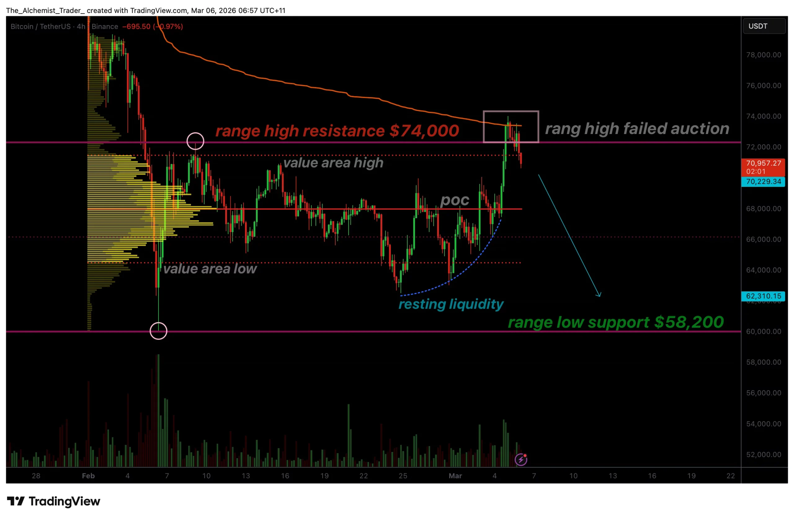 Bitcoin price has confirmed a failed auction at the $74,000 range-high resistance after a sharp rejection. …