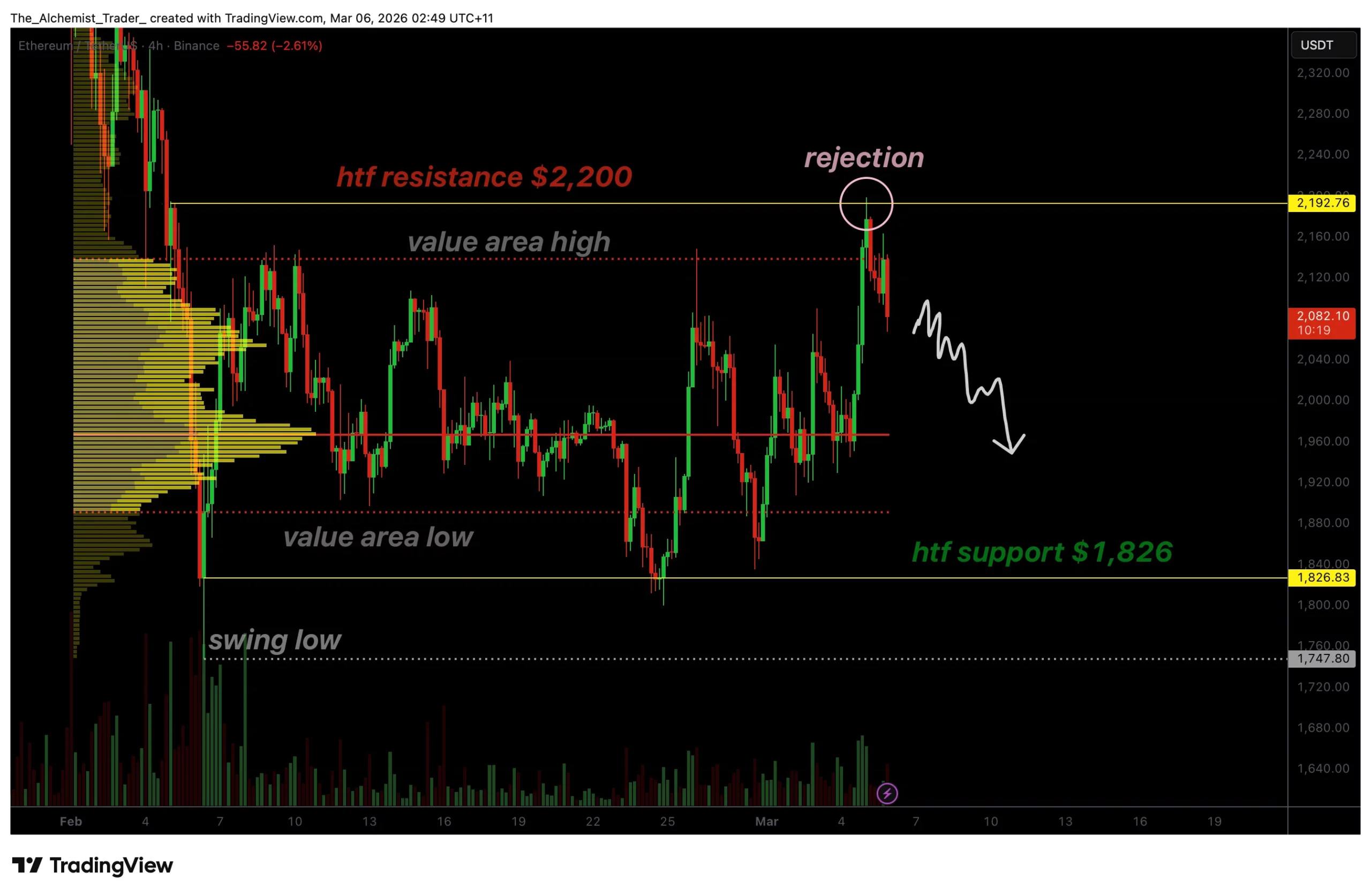 Ethereum price has rejected the $2,200 resistance level after failing to sustain momentum above a key value area high. …