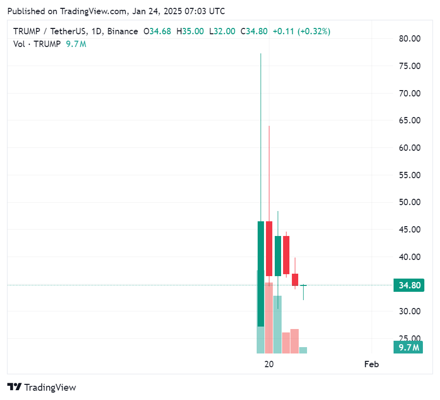 Launched on Jan. 18, the weekend before Trump’s inauguration, the official Trump meme coin reached a market cap of more than $10 billion in less than 24 hours after its launch. However, its value has since crashed by more than 50%, from $73 to $34. According to data from crypto.news, TRUMP’s market cap currently stands at $6.8 billion.