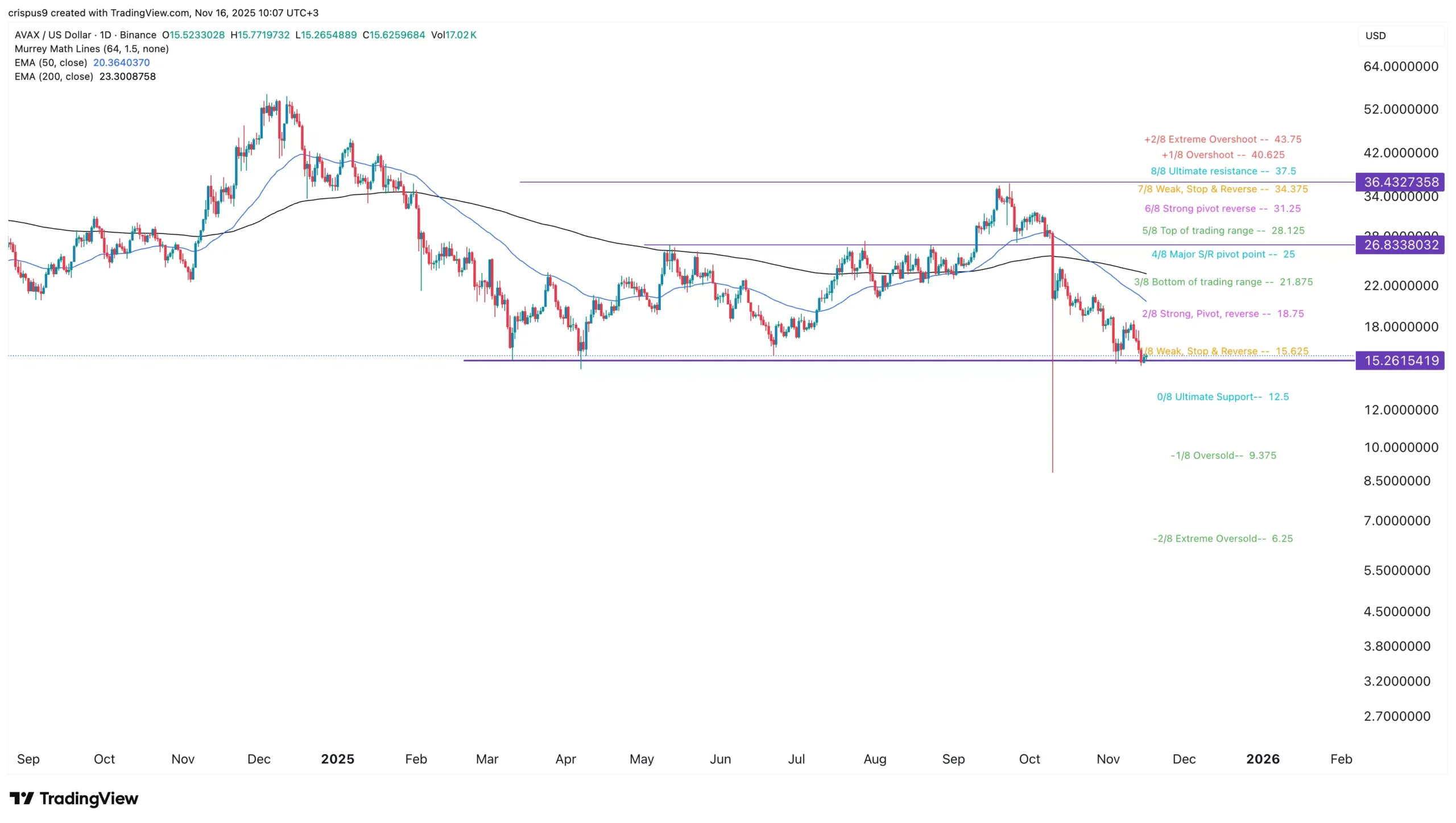 The daily timeframe chart shows that the AVAX price has crashed from a high of $36 in October to the current $15.25. It has settled at a crucial support where it has failed to move below since March 10.