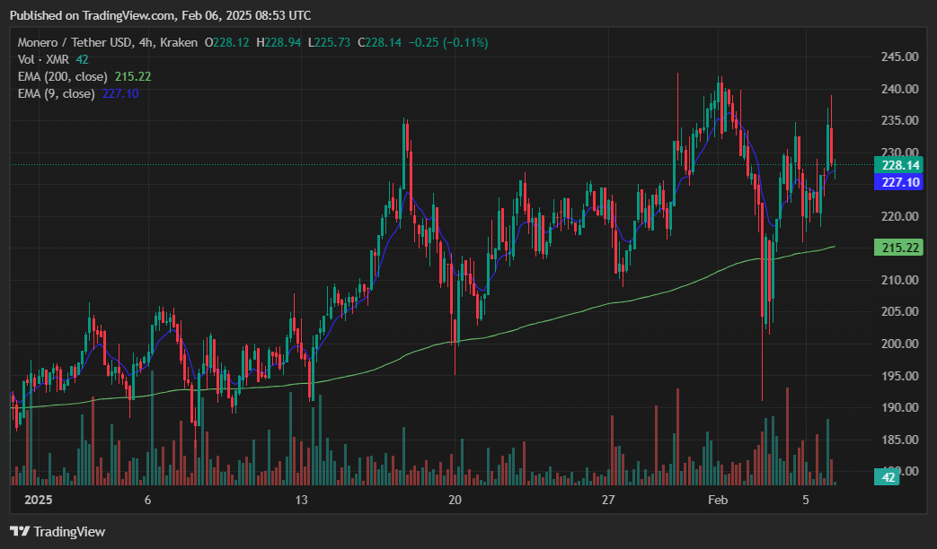 Monero (XMR) surged to an intraday high of $238.55, extending its gains to 24% since the beginning of the year. The privacy-focused coin’s market cap surpassed $4.4 billion, briefly making it the 28th largest crypto asset per CoinMarketCap, before settling at $4.28 billion as of the last check during the afternoon Asian session.