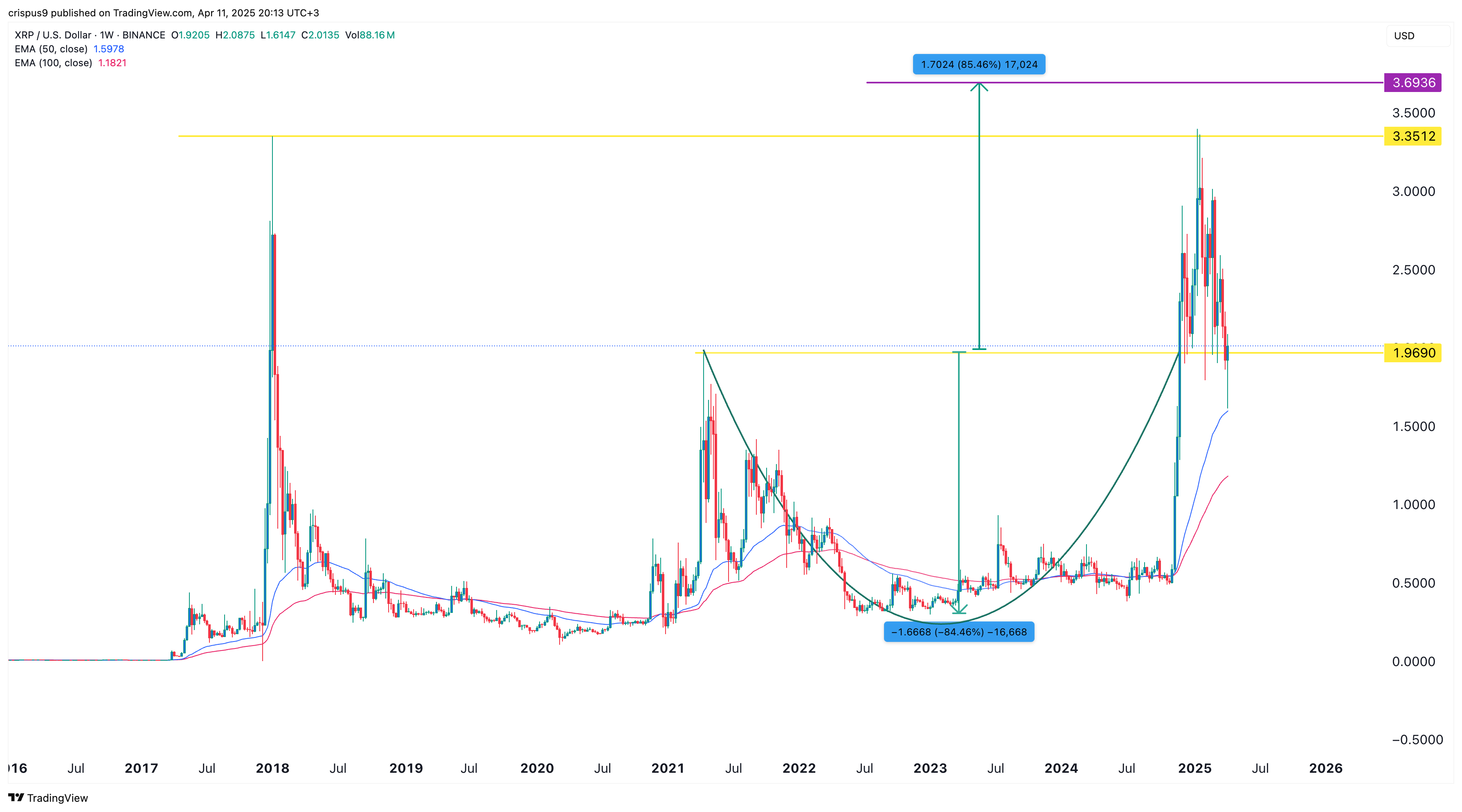 XRP, in contrast, has technical support that signals a possible rebound. On the weekly chart, it has pulled back and retested the $2 level, which marks the upper edge of a cup and handle pattern. This formation is generally considered a bullish continuation signal.