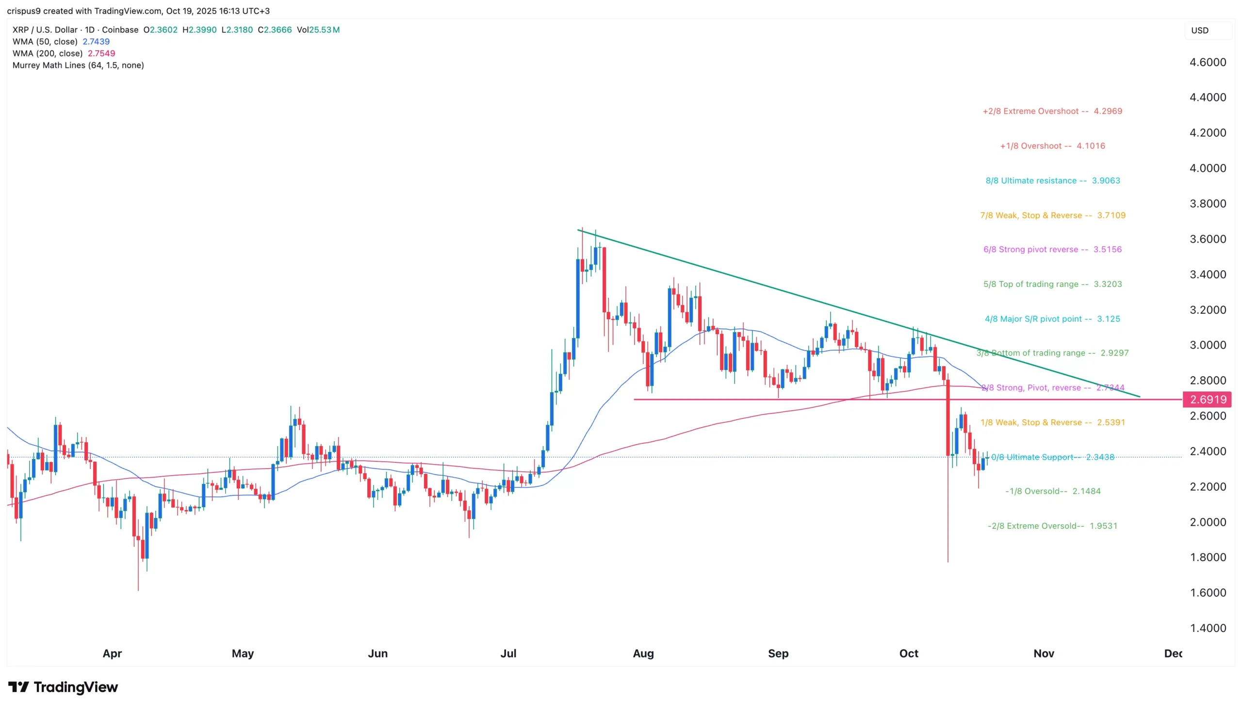 The daily chart shows that the Ripple (XRP) token was trading at $2.3700 today, Oct. 19, up by 33% from its lowest point this month. This price coincides with the ultimate support of the Murrey Math Lines tool.