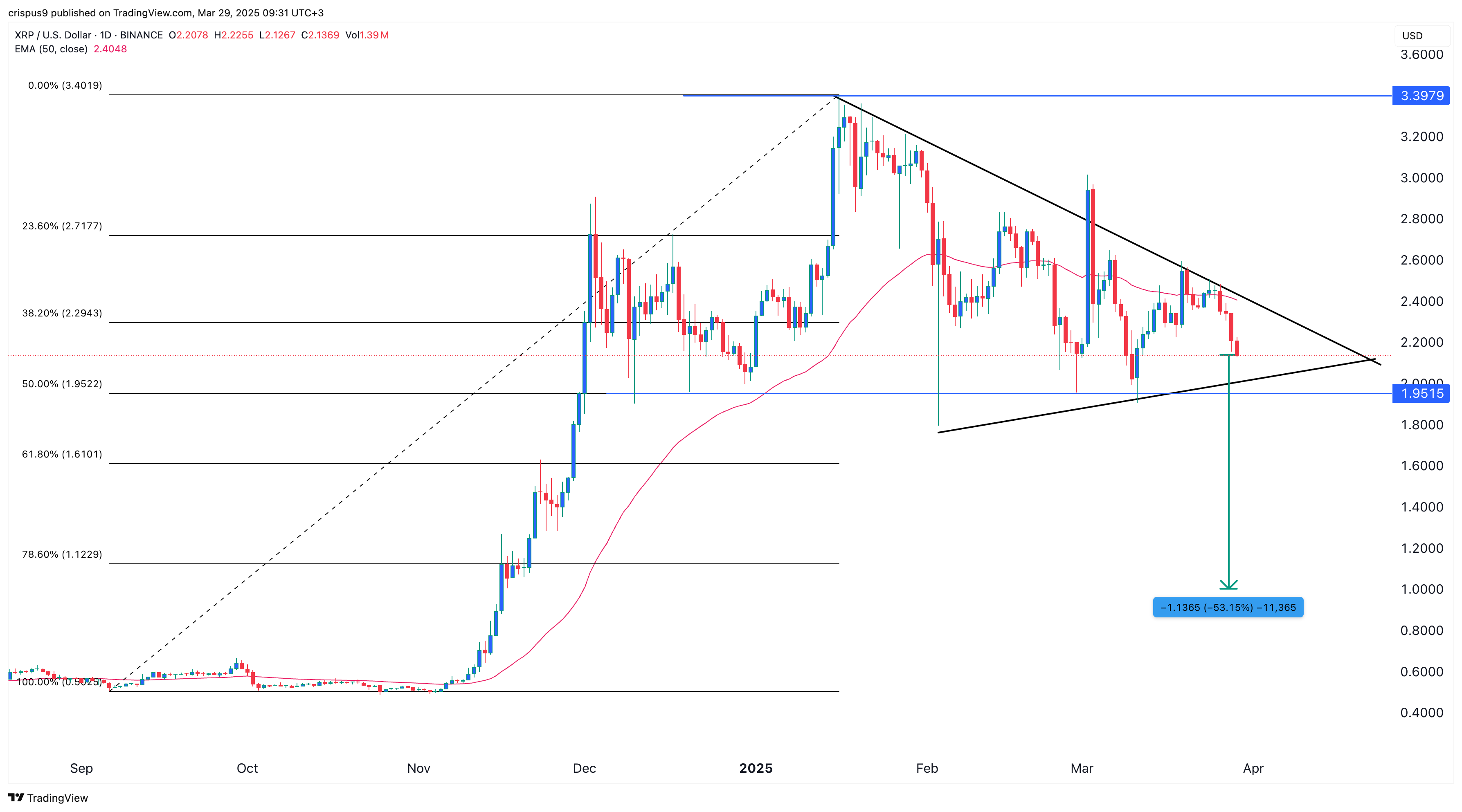 The daily chart shows that the XRP price has crashed in the past few months. It peaked at $3.40 in January and has now plunged to $2.31.