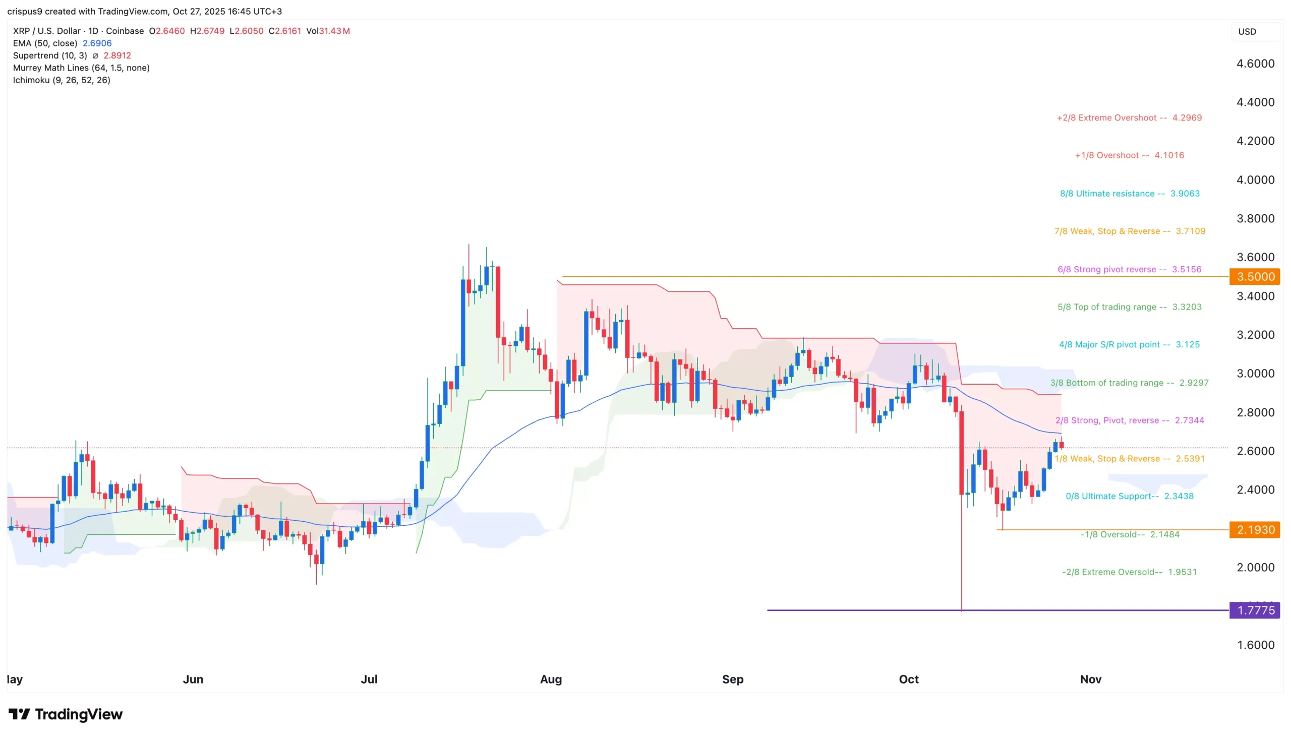 Ripple price is also slightly below the strong pivot reverse point of the Murrey Math Lines tool.