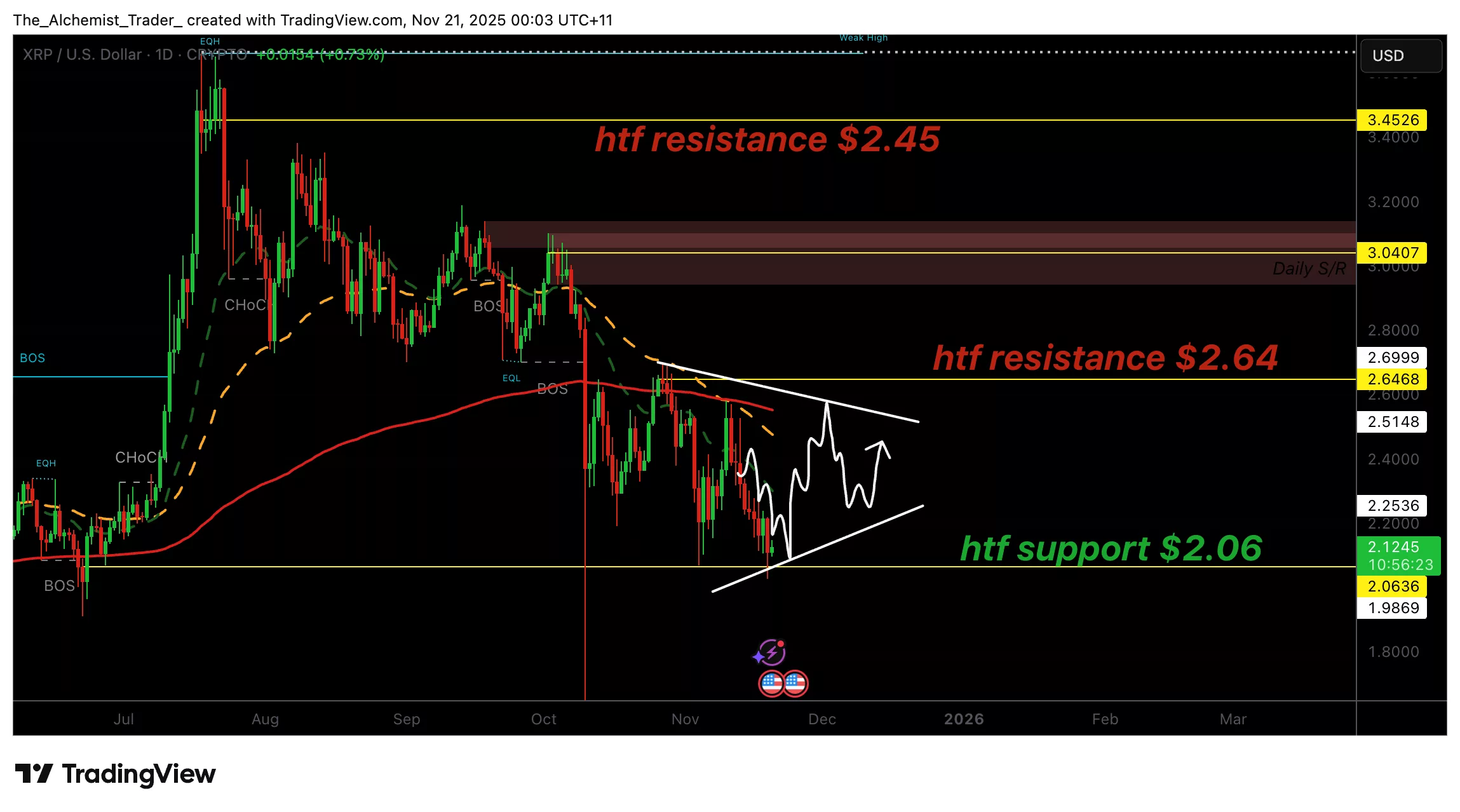 The emerging pennant formation strengthens this outlook. Pennants often occur after strong directional moves and serve as consolidation structures before the next expansion phase begins. In XRP’s case, price is compressing into a tighter range while repeatedly bouncing from the high-time-frame support. This behaviour suggests that the market is preparing for an apex breakout, with pressure building as liquidity tightens.